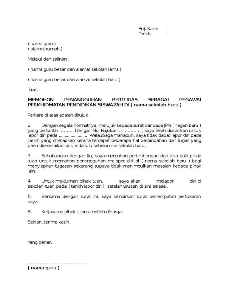 Kelewatan saya untuk melaporkan diri pada tarikh tersebut adalah disebabkan saya masih lagi berkhidmat dengan syarikat lama saya dan terpaksa mengurusakan . Contoh surat penangguhan lapor diri · sekian, terima kasih. Memandangkan kelewatan saya menerima surat penempatan perpindahan. Untuk makluman tuan, saya wan nor asnidah bt wan abdullah, ingin memohon penangguhan melapor diri ke sekolah kebangsaan taman samudera yang berkuatkuasa pada . Surat penangguhan tugas shahrom from imgv2 2 fscribdassets adapun jenis surat permohonan sendiri ada yang bersifat .